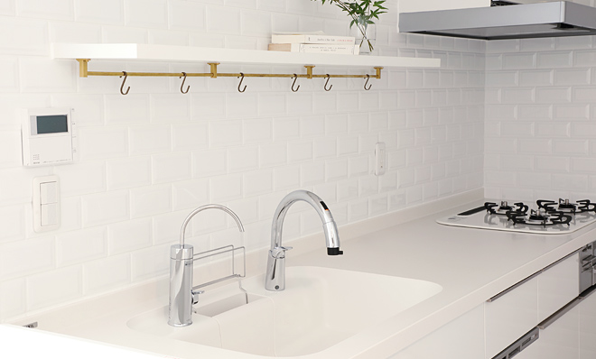 *白いタイルに囲まれたワイド2700サイズのゆとりのキッチン