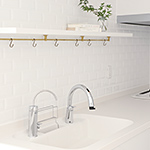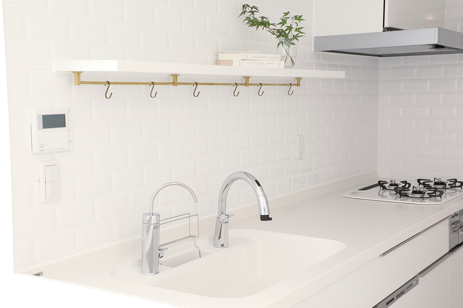 *白いタイルに囲まれたワイド2700サイズのゆとりのキッチン